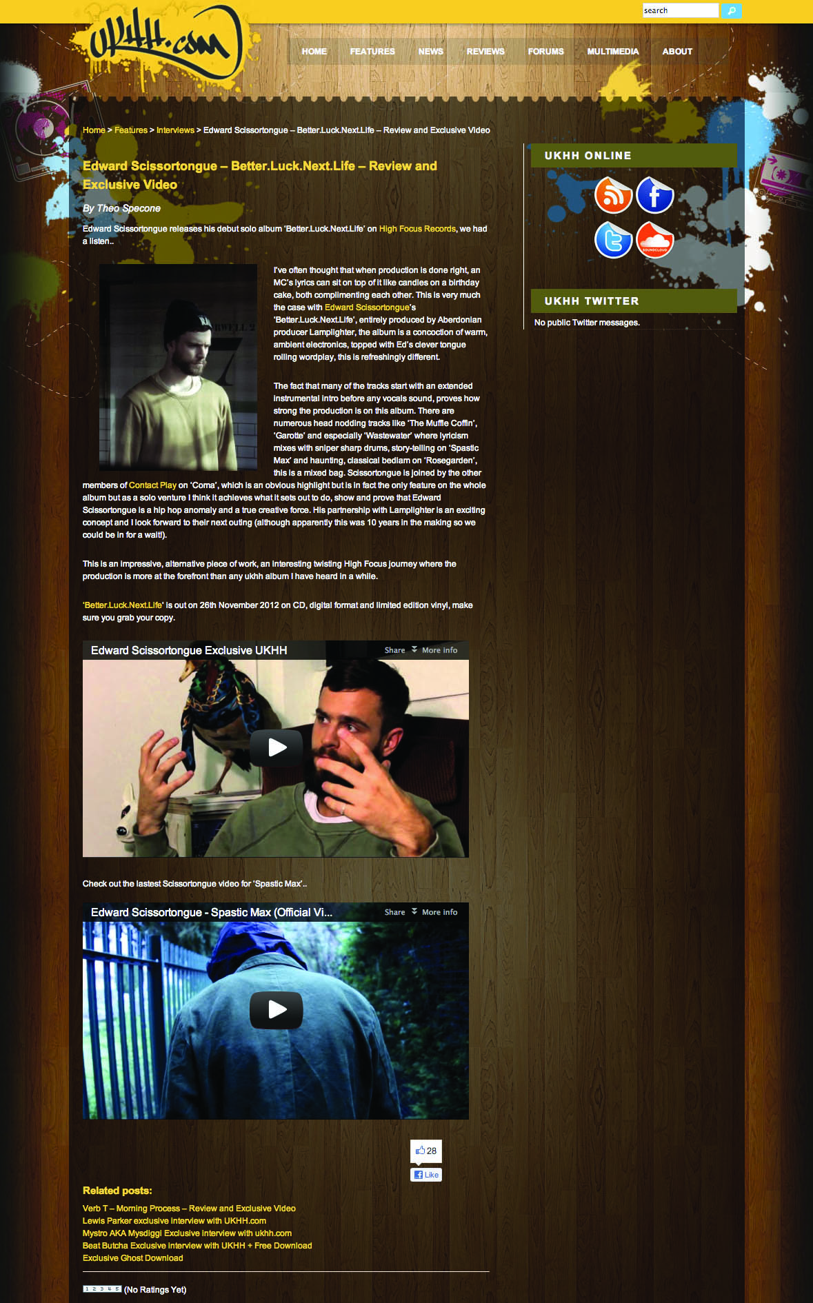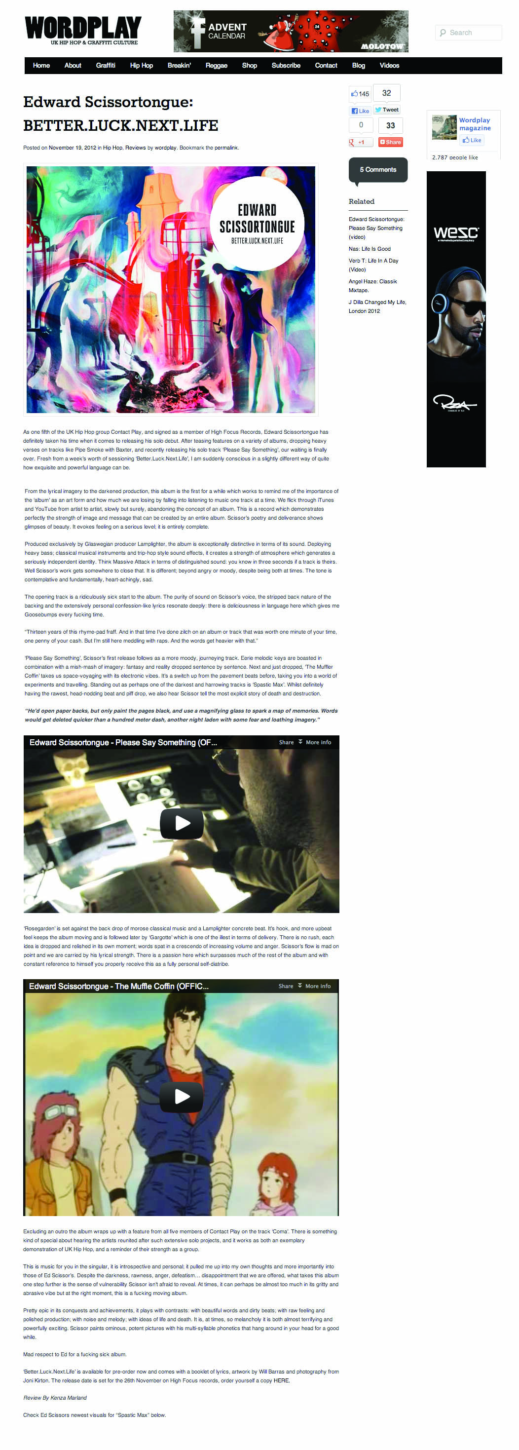 Edward Scissortongue – ‘Better.Luck.Next.Life’ Album review by Wordplay High Focus2013-02-13T18:27:28+00:00December 13th, 2012|Ed Scissortongue, Press| Edward Scissortongue – ‘Better.Luck.Next.Life’ Album review by […]