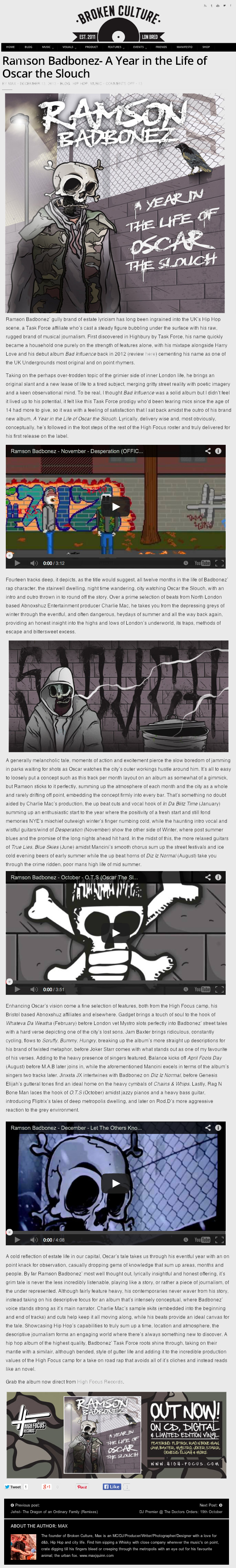 Ramson Badbonez – A Year In The Life Of Oscar The Slouch – Broken Culture Album Review High Focus2013-12-13T13:13:44+00:00December 13th, 2013|Press, Ramson Badbonez| http://www.broken-culture.co.uk/ramson-badbonez-year-life-oscar-slouch/