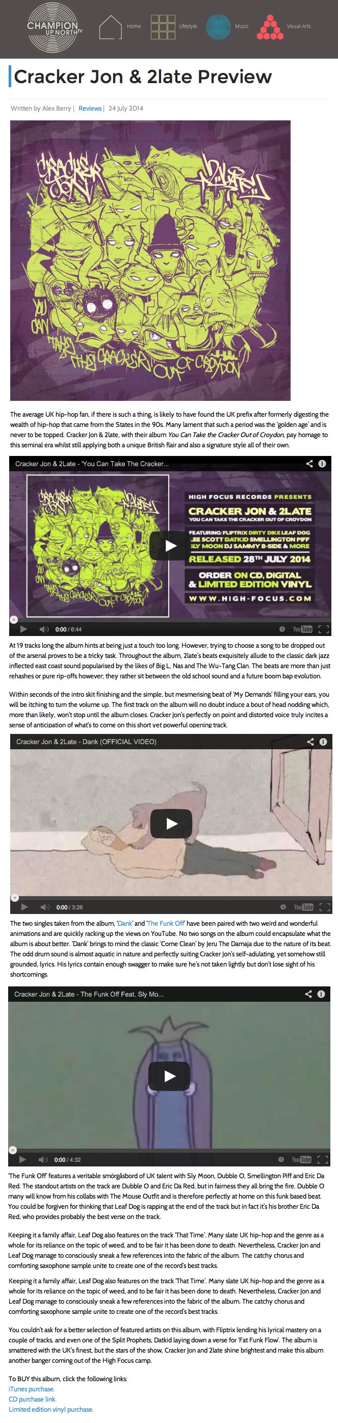 Cracker Jon & 2Late – You Can Take The Cracker Out Of Croydon – Champion Up North Review High Focus2014-07-25T14:26:58+00:00July 25th, 2014|Cracker Jon & 2Late, Press| http://championupnorth.com/music/reviews/cracker-jon-2late-preview