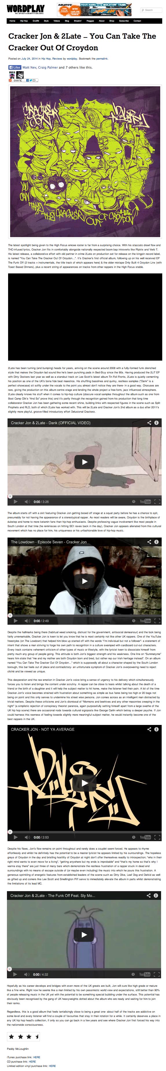 Cracker Jon & 2Late – You Can Take The Cracker Out Of Croydon – Wordplay Magazine Review High Focus2014-07-25T14:32:06+00:00July 25th, 2014|Cracker Jon & 2Late, Press| http://www.wordplaymagazine.com/2014/07/reviews/cracker-jon-2late-can-take-cracker-croydon/