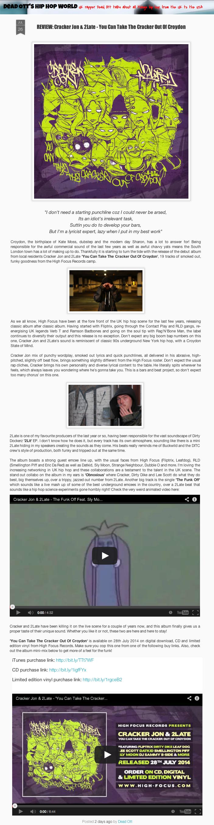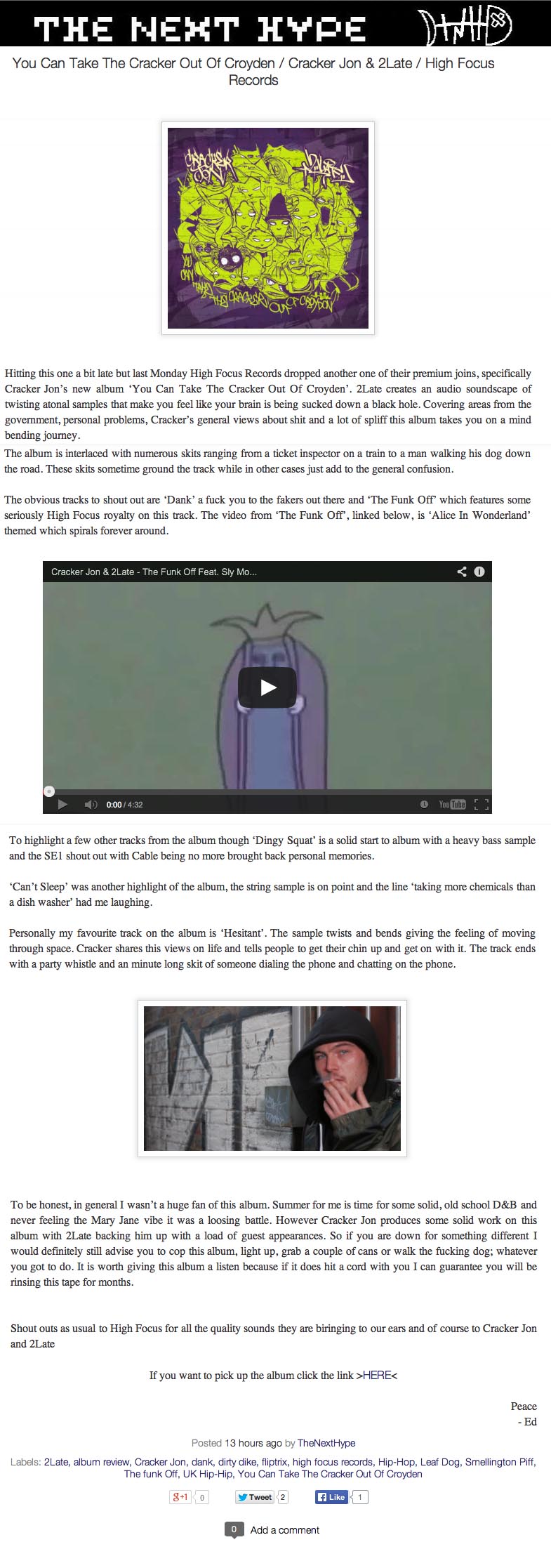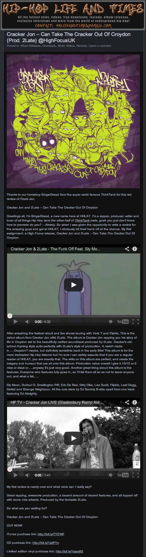Cracker Jon & 2Late – You Can Take The Cracker Out Of Croydon – Hip Hop Life & Times Review High Focus2014-08-28T15:19:30+00:00August 19th, 2014|Cracker Jon & 2Late, Press| http://hiphoplifeandtimes.com/2014/08/27/cracker-jon-can-take-the-cracker-out-of-croydon-prod-2late-highfocusuk/