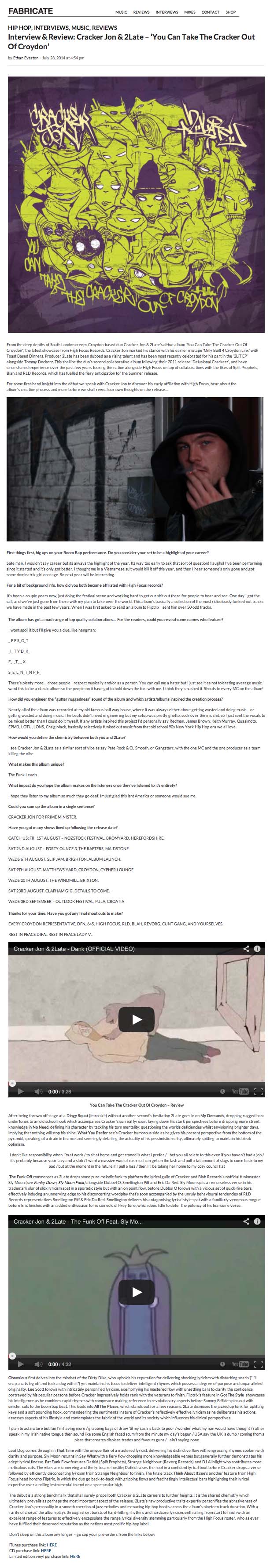Cracker Jon & 2Late – You Can Take The Cracker Out Of Croydon – Fabricate Interview & Review High Focus2014-07-28T17:30:57+00:00July 28th, 2014|Cracker Jon & 2Late, Press| http://www.fabricate-uk.com/interview-review-cracker-jon-2late-you-can-take-the-cracker-out-of-croydon/