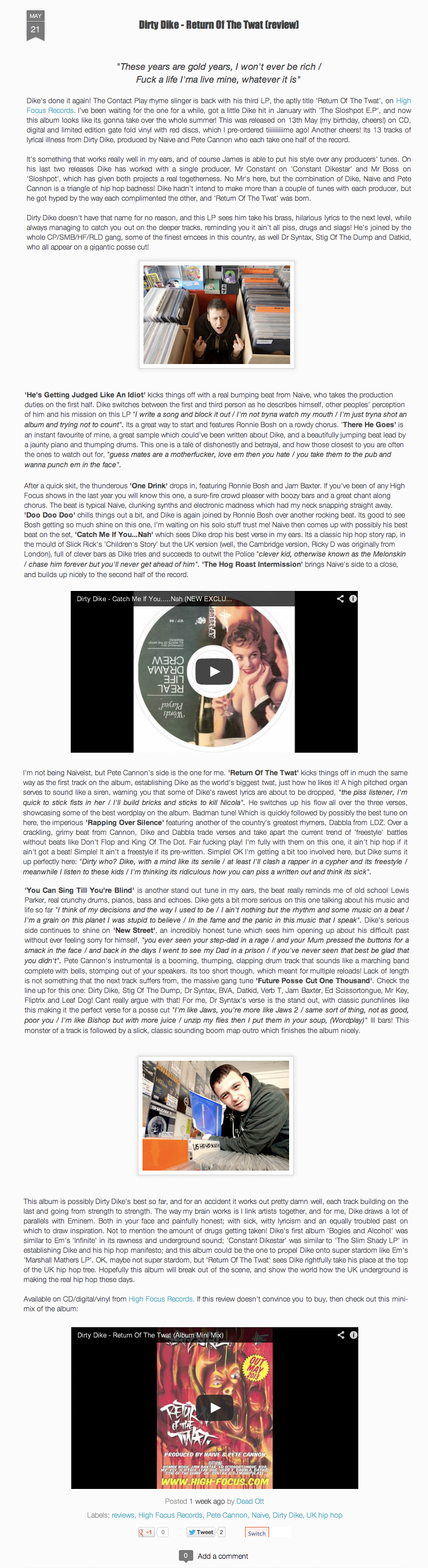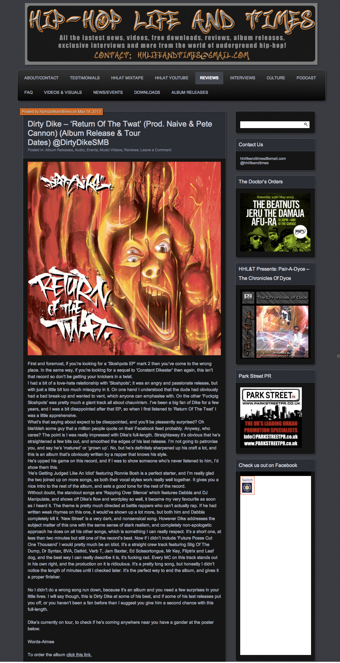 Dirty Dike – Return Of The Twat – Hip Hop Life & Times Review High Focus2013-08-02T12:31:29+00:00May 14th, 2013|Dirty Dike, Press|