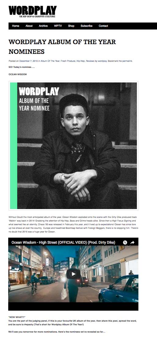 Ocean Wisdom – ‘Chaos 93’ – Nominated For Wordplay Magazine Album Of The Year Award! High Focus2016-12-14T10:41:48+00:00December 14th, 2016|Dirty Dike, Ocean Wisdom, Press| http://wordplaymagazine.com/2016/12/articles/reviews/wordplay-album-of-the-year-nominees/