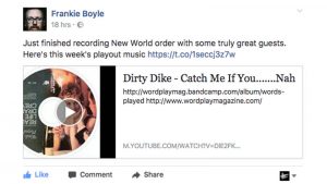 Comedian Frankie Boyle Uses Dirty Dike’s ‘Catch If Me You… Nah’ On ‘New World Order’ BBC 2 Show High Focus2017-08-08T11:41:41+00:00June 30th, 2017|Dirty Dike, Press| http://www.bbc.co.uk/programmes/b08tpkbm