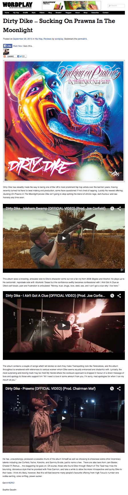 Dirty Dike – ‘Sucking On Prawns In The Moonlight’ – Wordplay Magazine Album Review High Focus2015-09-29T11:31:50+00:00September 29th, 2015|Dirty Dike, Press| http://www.wordplaymagazine.com/2015/09/reviews/dirty-dike-sucking-on-prawns-in-the-moonlight/