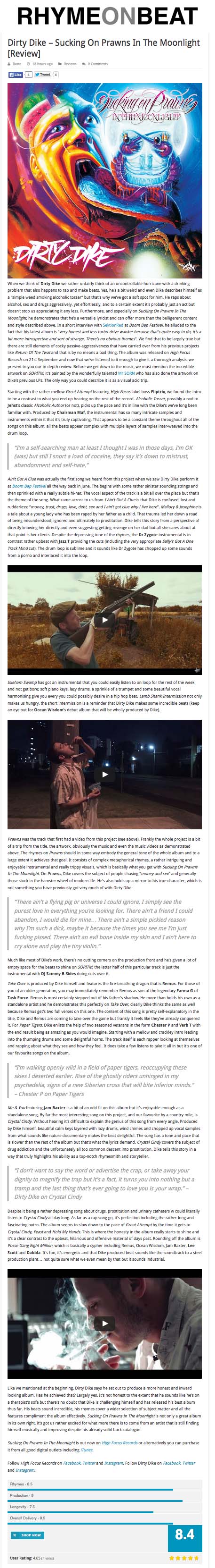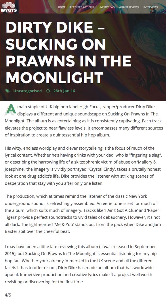 Dirty Dike – ‘Sucking On Prawns In The Moonlight’ – RhymeOnBeat Album Review High Focus2015-10-26T11:16:04+00:00October 26th, 2015|Dirty Dike, Press| http://www.rhymeonbeat.com/2015/10/dirty-dike-sucking-on-prawns-in-the-moonlight-review/