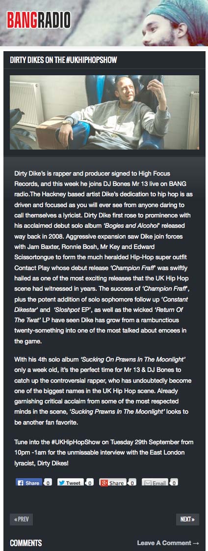 Dirty Dike – ‘Sucking On Prawns In The Moonlight’ – Exclusive Interview With Bang Radio High Focus2015-10-01T12:21:32+00:00October 1st, 2015|Dirty Dike, Press| http://wearebang.com/index.php/dirty-dikes-on-the-ukhiphopshow/#sthash.P60C37wg.dpbs