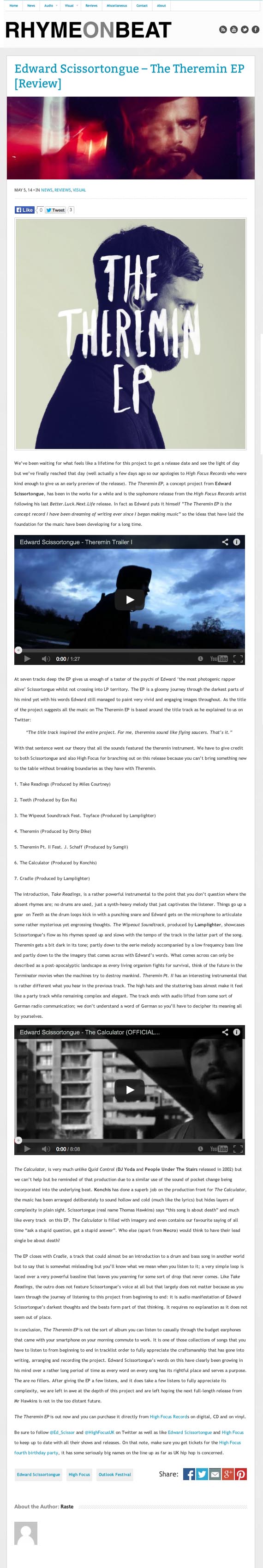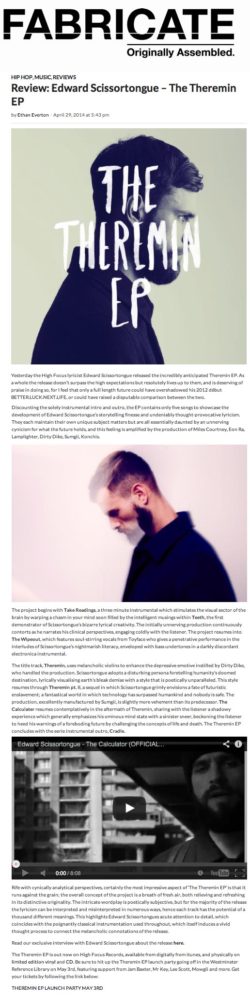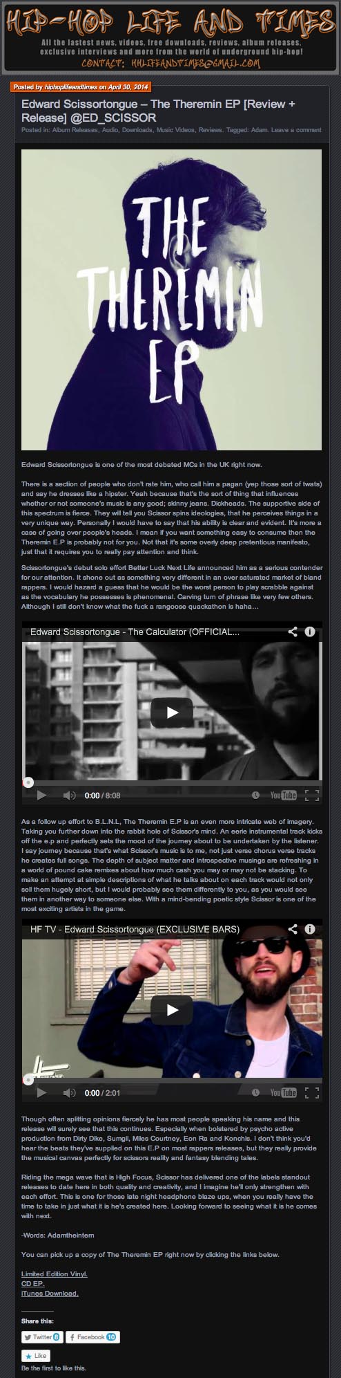 Edward Scissortongue – The Theremin EP – Hip Hop Life And Times Review High Focus2014-05-06T12:30:14+00:00May 6th, 2014|Ed Scissortongue, Press| http://hiphoplifeandtimes.com/2014/04/30/edward-scissortongue-the-theremin-ep-review-release-ed_scissor/