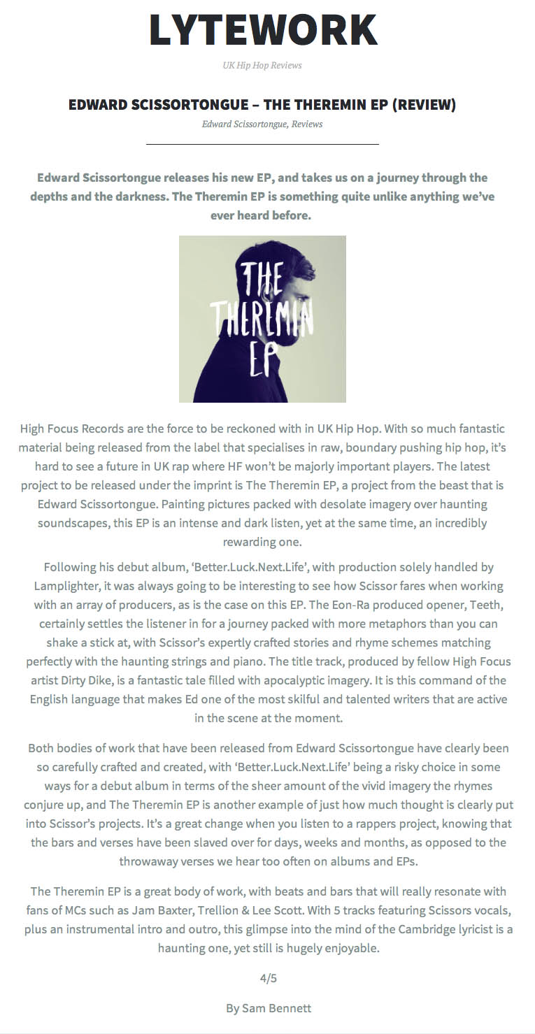 Edward Scissortongue – The Theremin EP – Lytework Review High Focus2014-05-13T15:34:50+00:00May 13th, 2014|Ed Scissortongue, Press| http://lytework.wordpress.com/2014/05/13/edward-scissortongue-the-theremin-ep-review/