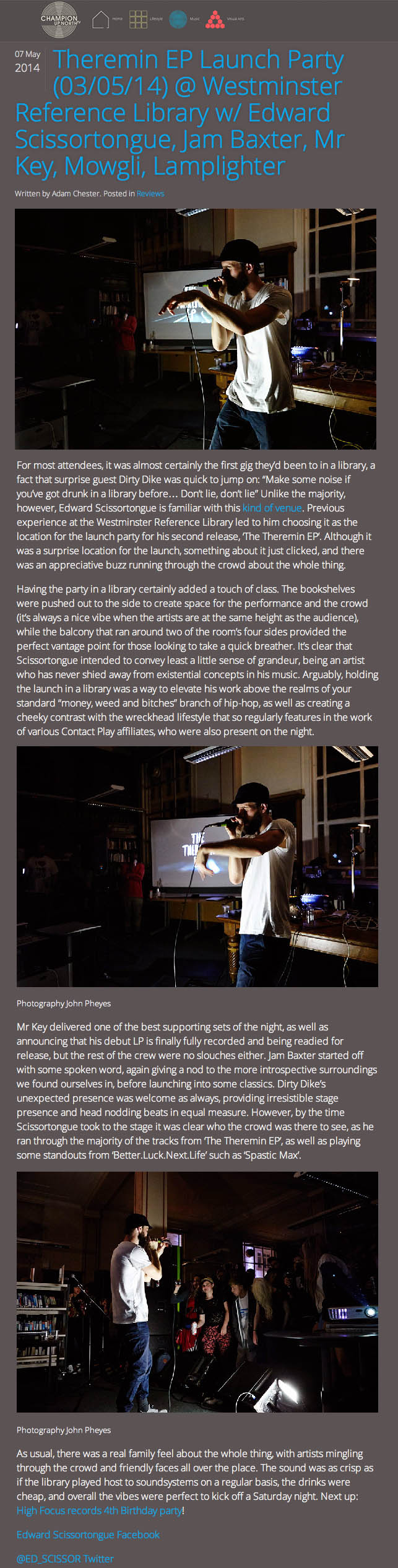 Edward Scissortongue – Champion Up North Theremin EP Launch Party Review High Focus2014-05-13T15:37:08+00:00May 13th, 2014|Ed Scissortongue, Press| http://championupnorth.com/music/reviews/theremin-ep-launch-party-03-05-14-westminster-reference-library-w-edward-scissortongue-jam-baxter-mr-key-mowgli-lamplighter