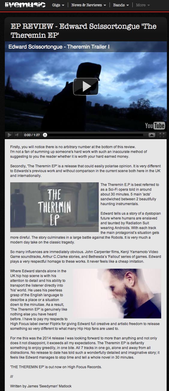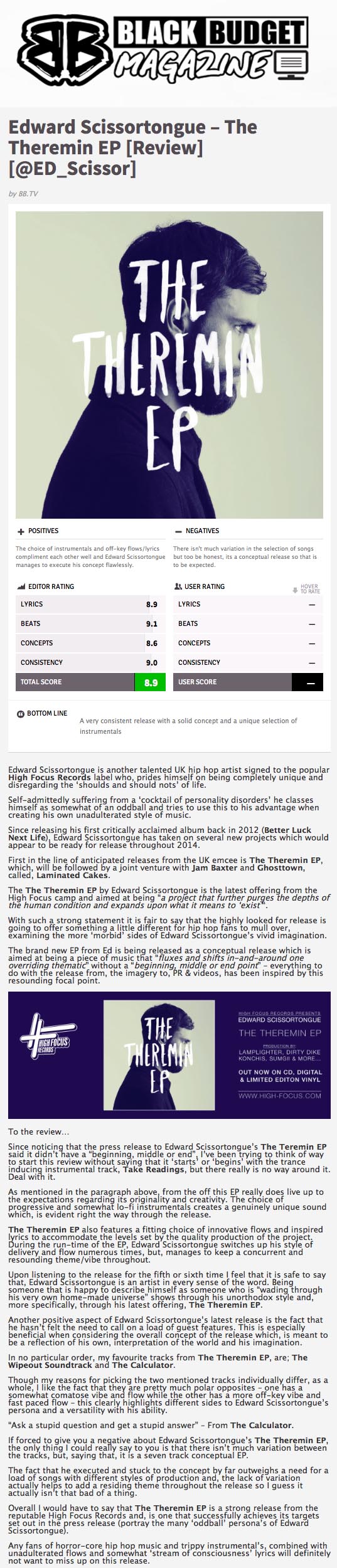 Edward Scissortongue – The Theremin EP – Eye Know Hip Hop Review High Focus2014-04-28T09:04:25+00:00April 28th, 2014|Ed Scissortongue, Press| http://eyeknowhiphop.wordpress.com/2014/04/26/edward-scissortongue-the-theremin-ep/