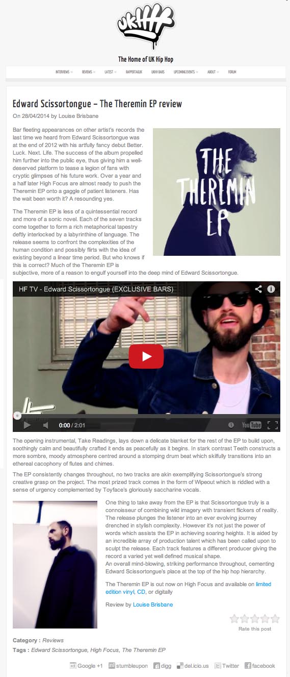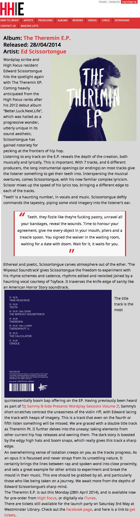 Edward Scissortongue – The Theremin EP – HHIE Review High Focus2014-04-28T09:00:47+00:00April 28th, 2014|Ed Scissortongue, Press| http://www.hiphopinenglish.com/reviews/edward-scissortongue-theremin-e-p/
