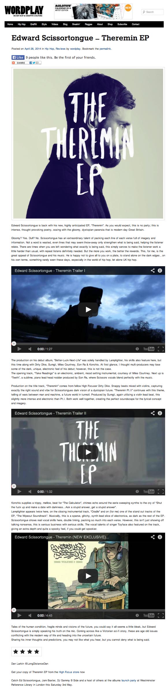 Edward Scissortongue – The Theremin EP – Wordplay Magazine Review High Focus2014-04-28T13:05:12+00:00April 28th, 2014|Ed Scissortongue, Press| http://www.wordplaymagazine.com/2014/04/reviews/edward-scissortongue-theremin-ep/
