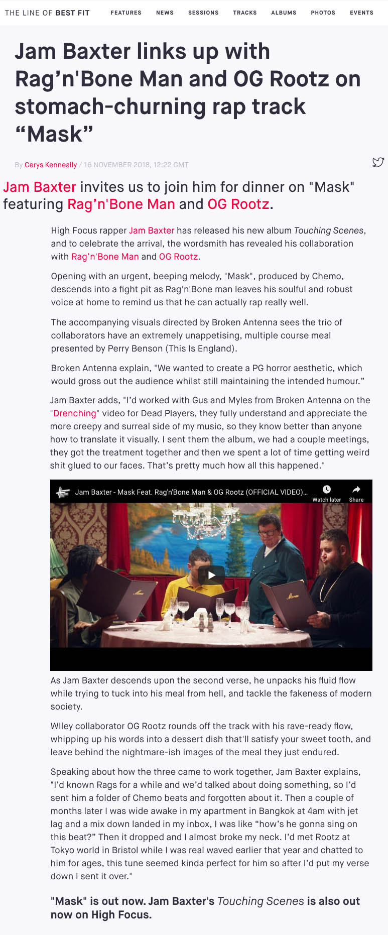 Jam Baxter – ‘Mask’ Featuring Rag’n’Bone Man & OG Rootz – The Line Of Best Fit High Focus2018-11-16T13:53:34+00:00November 16th, 2018|Jam Baxter, Press| https://www.thelineofbestfit.com/new-music/discovery/jam-baxter-mask