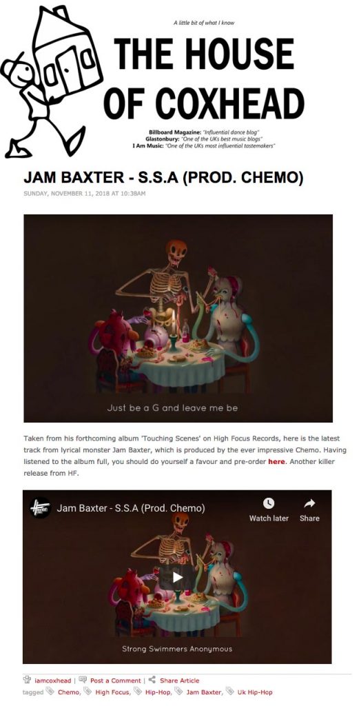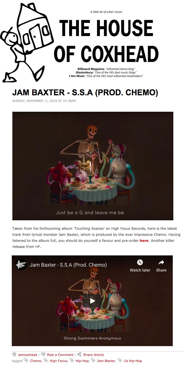 Jam Baxter – ‘Touching Scenes’ – House Of Coxhead Feature High Focus2018-11-13T10:52:19+00:00November 13th, 2018|Jam Baxter, Press| http://www.thehouseofcoxhead.com/home/2018/11/11/jam-baxter-ssa-prod-chemo.html