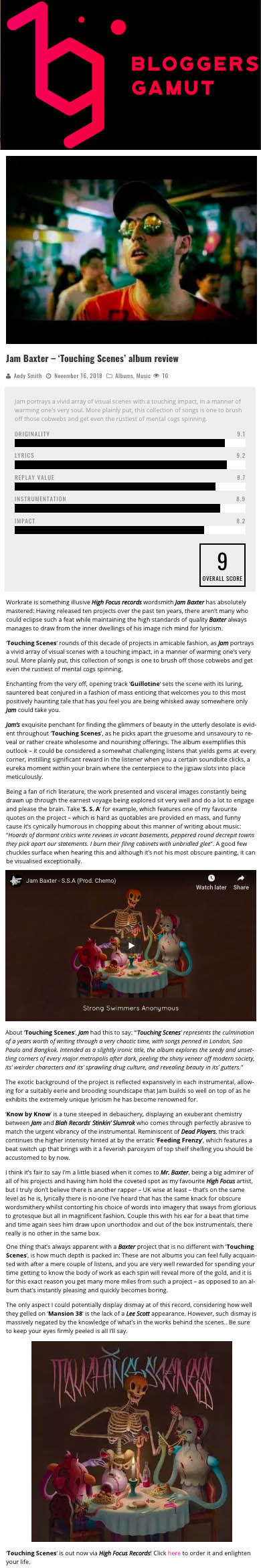 Jam Baxter – ‘Touching Scenes’ – Blogger’s Gamut Album Review High Focus2018-11-16T12:43:00+00:00November 16th, 2018|Jam Baxter, Press| http://bloggersgamut.com/albums/jam-baxter-touching-scenes-album-review/