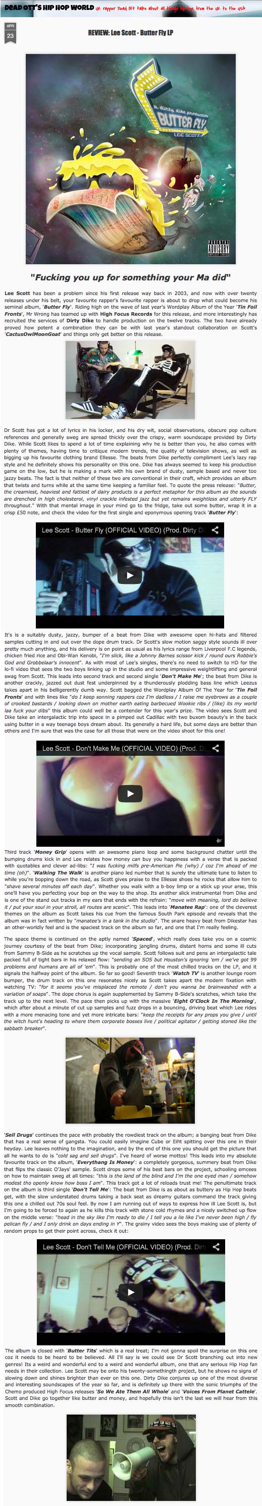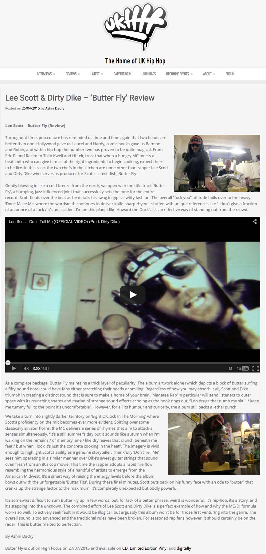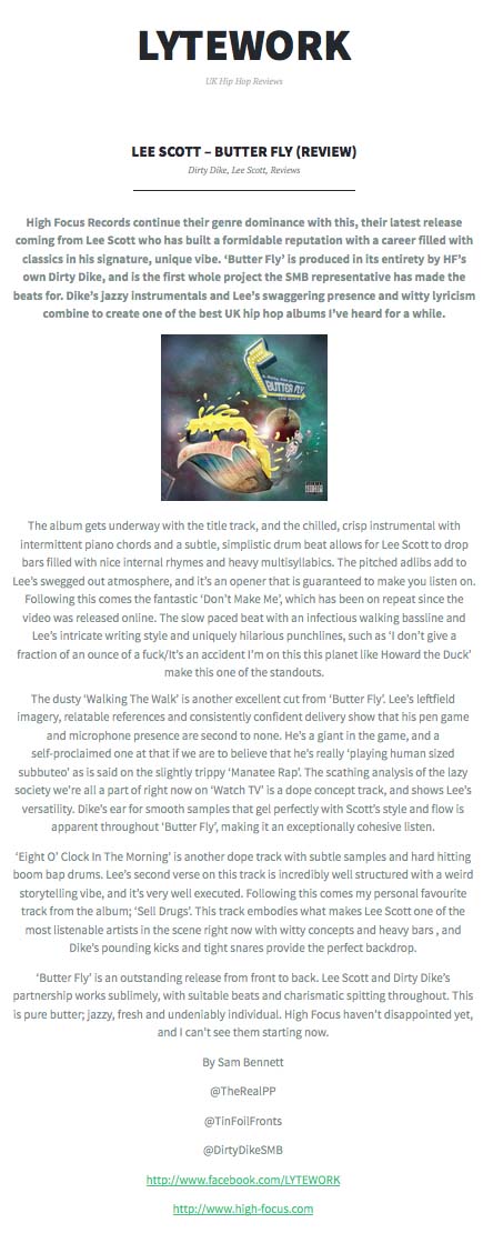 Lee Scott – ‘Butter Fly’ (Prod. Dirty Dike) – UKHH Album Review High Focus2015-04-27T10:06:24+00:00April 27th, 2015|Dirty Dike, Lee Scott, Press| http://www.ukhh.com/reviews/lee-scott-dirty-dike-butter-fly-review/