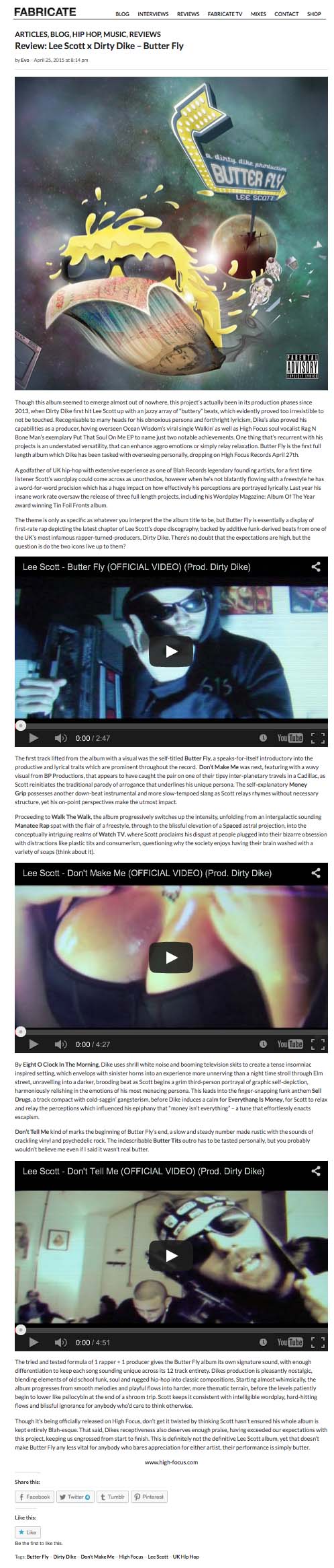 Lee Scott – ‘Butter Fly’ (Prod. Dirty Dike) – Fabricate Album Review High Focus2015-04-27T10:08:48+00:00April 27th, 2015|Dirty Dike, Lee Scott, Press| http://www.fabricate-uk.com/review-lee-scott-x-dirty-dike-butter-fly/