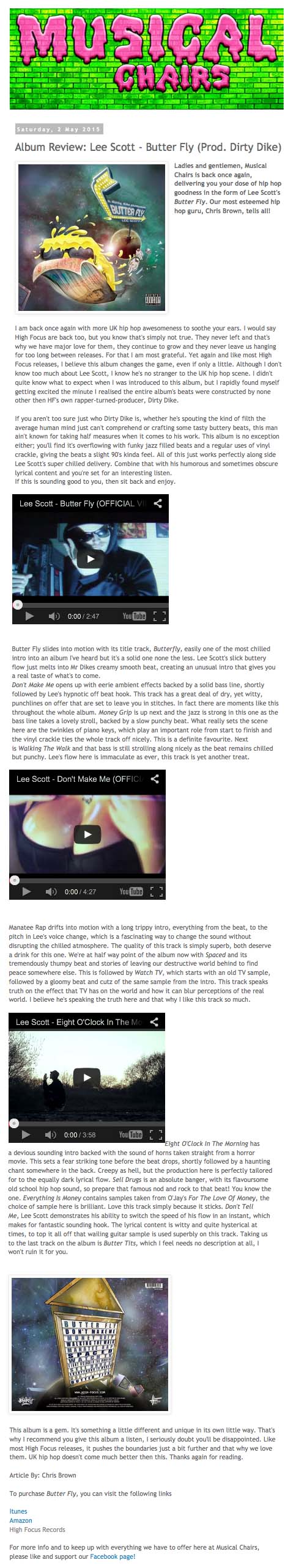 Lee Scott – ‘Butter Fly’ (Prod. Dirty Dike) – Musical Chairs Album Review High Focus2015-05-05T11:26:46+00:00May 5th, 2015|Dirty Dike, Lee Scott, Press| http://musical-chairs-blog.blogspot.co.uk/2015/05/album-review-lee-scott-butter-fly-prod.html