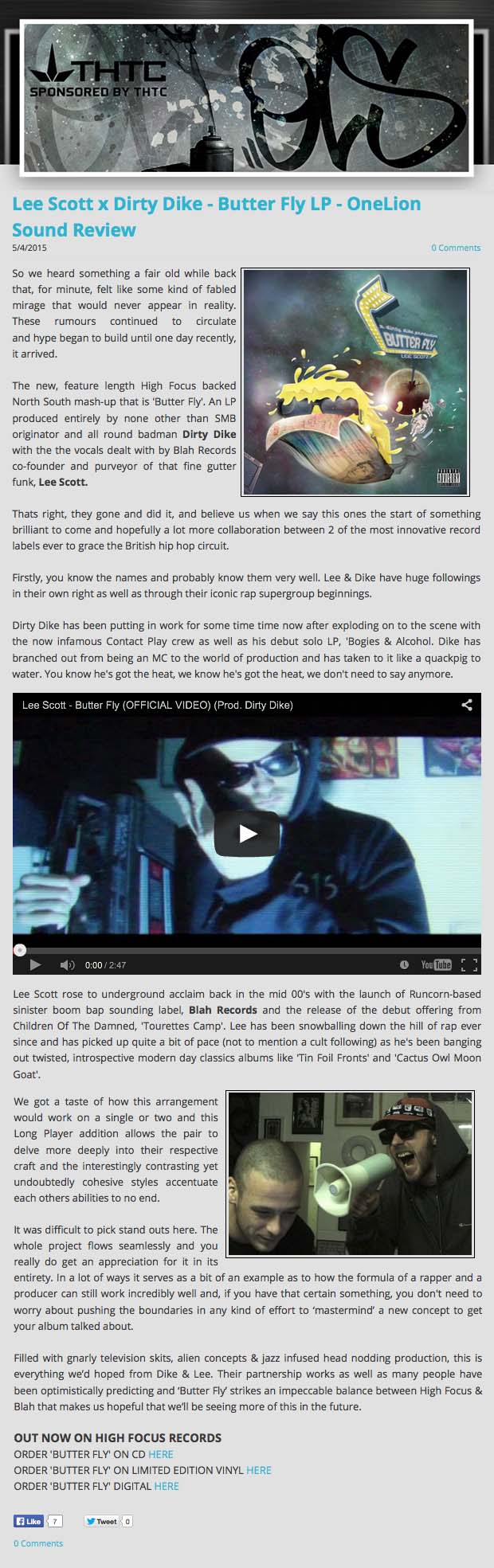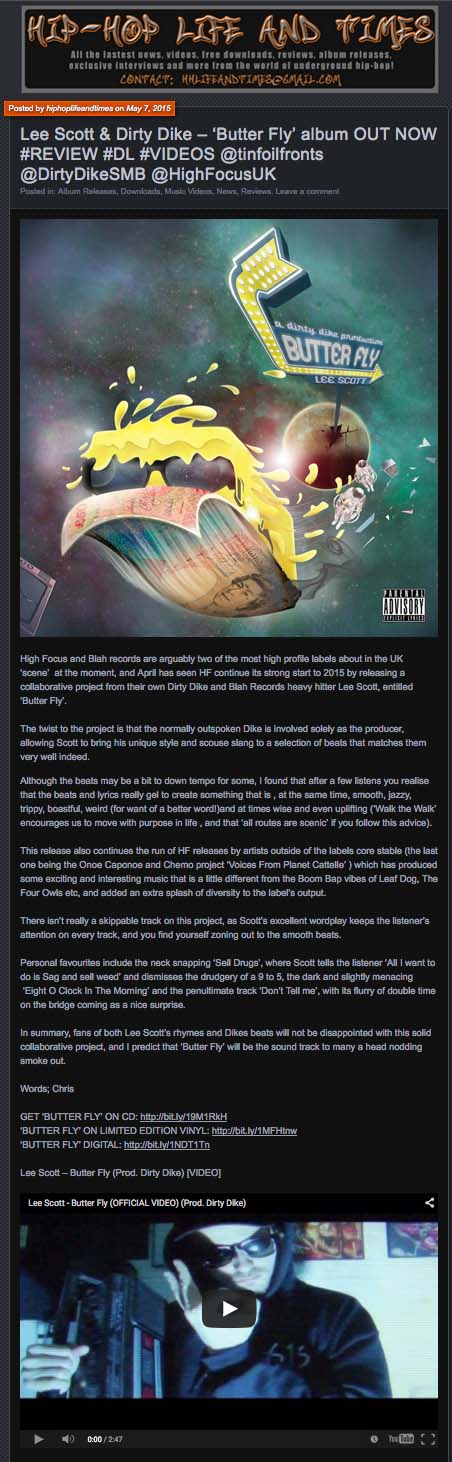 Lee Scott – ‘Butter Fly’ (Prod. Dirty Dike) – Hip Hop Life & Times Album Review High Focus2015-06-23T11:09:36+00:00June 23rd, 2015|Dirty Dike, Lee Scott, Press| http://hiphoplifeandtimes.com/2015/05/07/lee-scott-dirty-dike-butter-fly-album-out-now-review-dl-videos-tinfoilfronts-dirtydikesmb-highfocusuk/