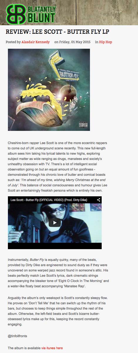 Lee Scott – ‘Butter Fly’ (Prod. Dirty Dike) – Blatantly Blunt Album Review High Focus2015-06-23T11:12:08+00:00June 23rd, 2015|Dirty Dike, Lee Scott, Press| http://www.blatantlyblunt.com/index.php/Blog/review-lee-scott-butter-fly-lp.html