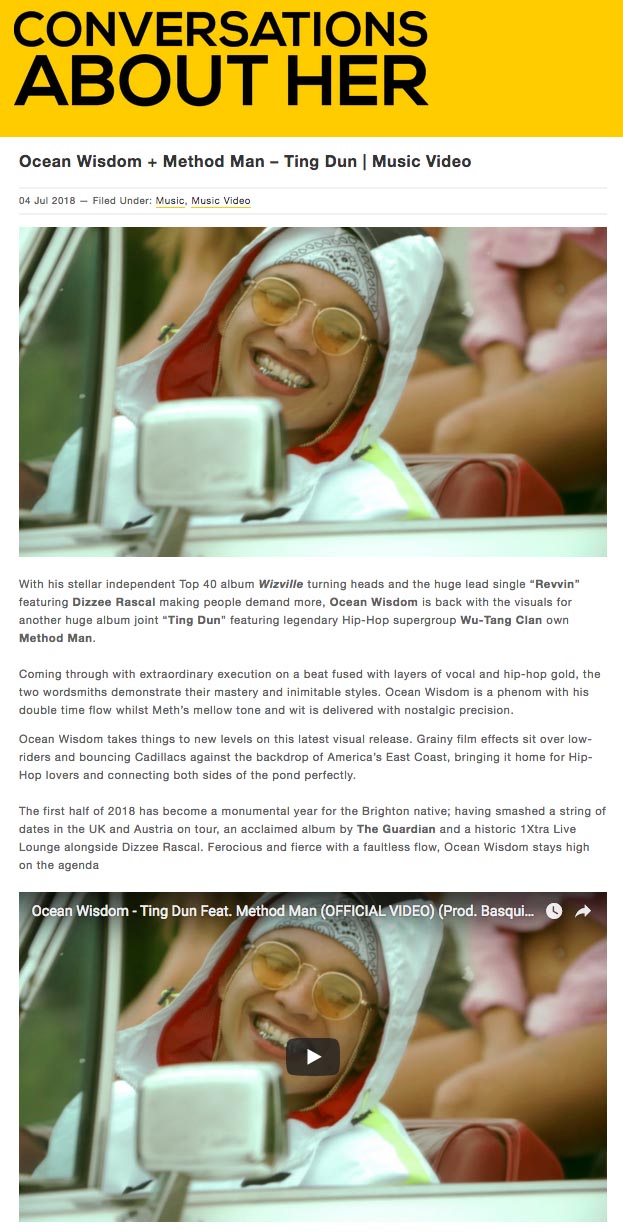 Ocean Wisdom – ‘Ting Dun’ Feat. Method Man – Conversations About Her Feature High Focus2018-07-05T14:49:32+00:00July 5th, 2018|Ocean Wisdom, Press| http://conversationsabouther.net/ocean-wisdom-method-man-ting-dun-music-video/