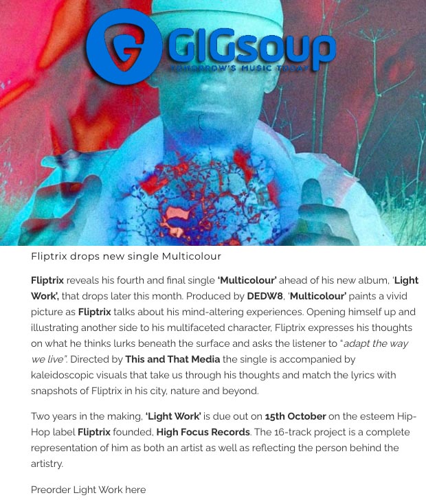 Fliptrix – ‘Multicolour’ – Gigsoup Feature High Focus2020-10-06T14:21:43+00:00October 6th, 2020|Fliptrix, Press| https://gigsoupmusic.com/pr/fliptrix-reveals-his-fourth-and-final-single-multicolour-ahead-of-his-new-album-light-work/