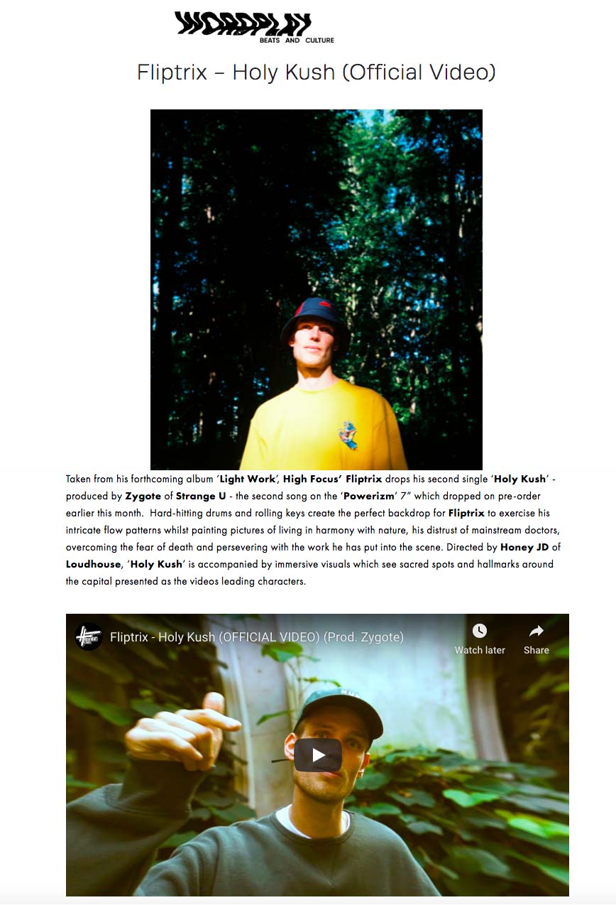 Fliptrix – ‘Holy Kush’ – Wordplay Magazine Feature High Focus2020-09-15T08:07:12+00:00September 15th, 2020|Fliptrix, Press| https://www.wordplaymagazine.com/blog-1/2020/8/27/fliptrix-holy-kush-official-video