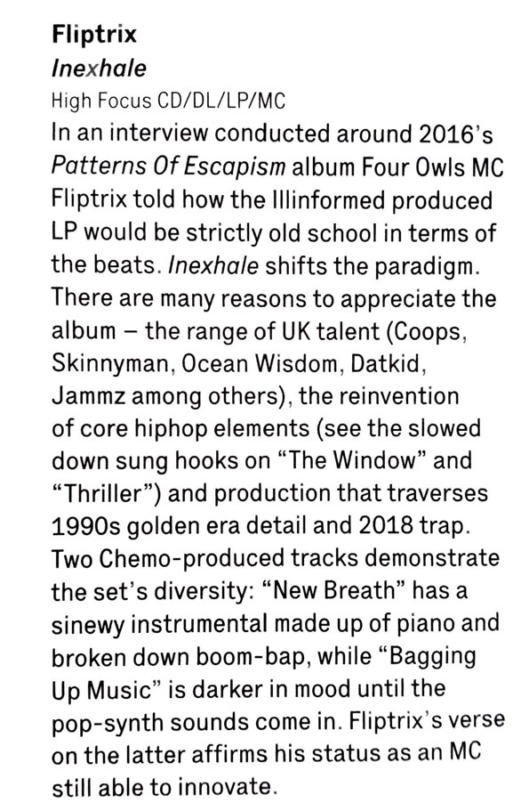 Fliptrix – ‘Inexhale’ – The Wire Magazine Album Review High Focus2018-09-14T13:02:52+00:00September 11th, 2018|Fliptrix, Press| https://www.thewire.co.uk/issues/416
