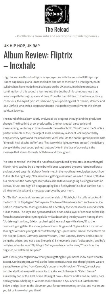 Fliptrix – ‘Inexhale’ – The Reload Album Review High Focus2018-09-14T13:13:57+00:00September 12th, 2018|Fliptrix, Press| https://thereload.blog/2018/08/31/album-review-fliptrix-inexhale/