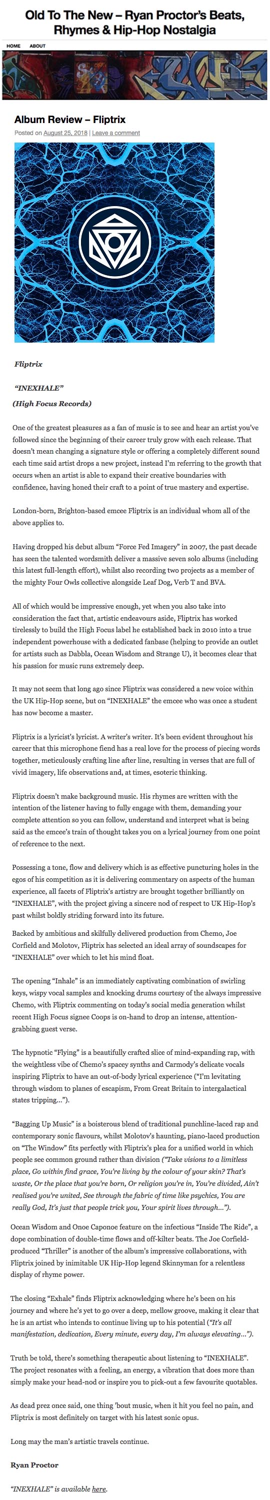 Fliptrix – ‘Inexhale’ – Old To The New Album Review High Focus2018-08-28T12:54:36+00:00August 28th, 2018|Fliptrix, Press| https://oldtothenew.wordpress.com/2018/08/25/album-review-fliptrix/