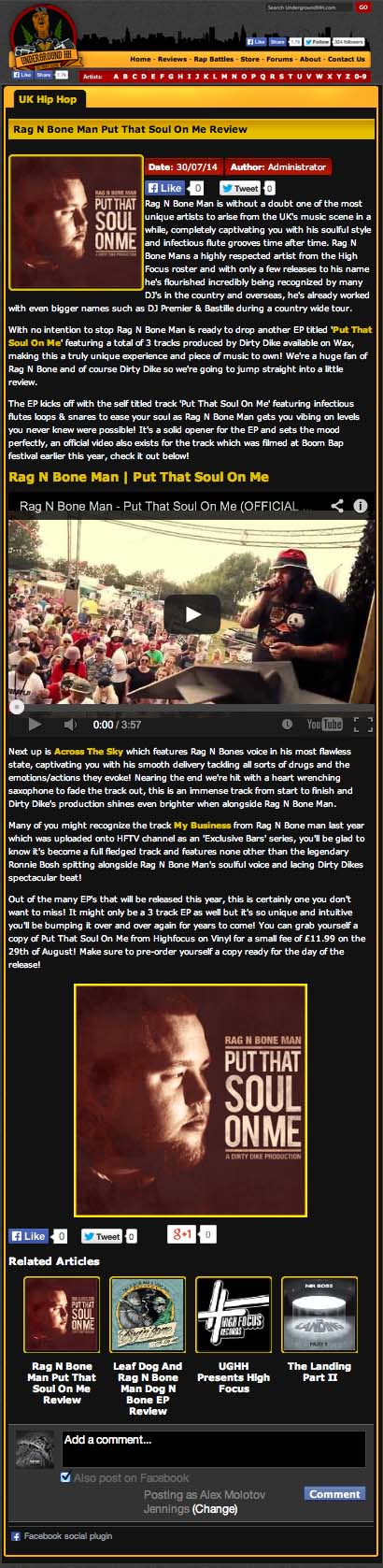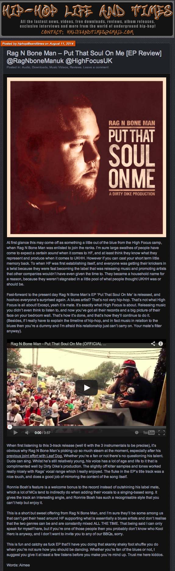 Rag N Bone Man – Put That Soul On Me – Hip Hop Life & Times Review High Focus2014-08-12T13:24:44+00:00August 12th, 2014|Dirty Dike, Press, Rag N Bone Man| http://hiphoplifeandtimes.com/2014/08/11/rag-n-bone-man-put-that-soul-on-me-ep-review-ragnbonemanuk-highfocusuk/