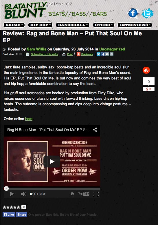 Rag N Bone Man – Put That Soul On Me – Blatantly Blunt Feature High Focus2014-08-04T15:25:50+00:00August 4th, 2014|Dirty Dike, Press, Rag N Bone Man| http://www.blatantlyblunt.com/review-rag-and-bone-man-put-that-soul-on-me-ep