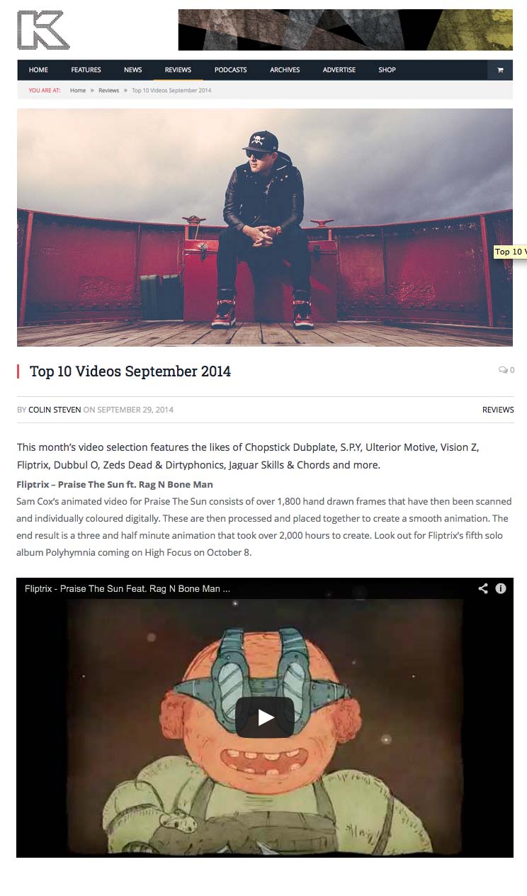 Fliptrix – ‘Praise The Sun’ Feat. Rag N Bone Man – Listed in top 10 music videos 2014 by Kmag High Focus2014-09-29T17:37:49+00:00September 29th, 2014|Fliptrix, Press, Rag N Bone Man| http://kmag.uk/2014/09/29/top-10-videos-september-2014/