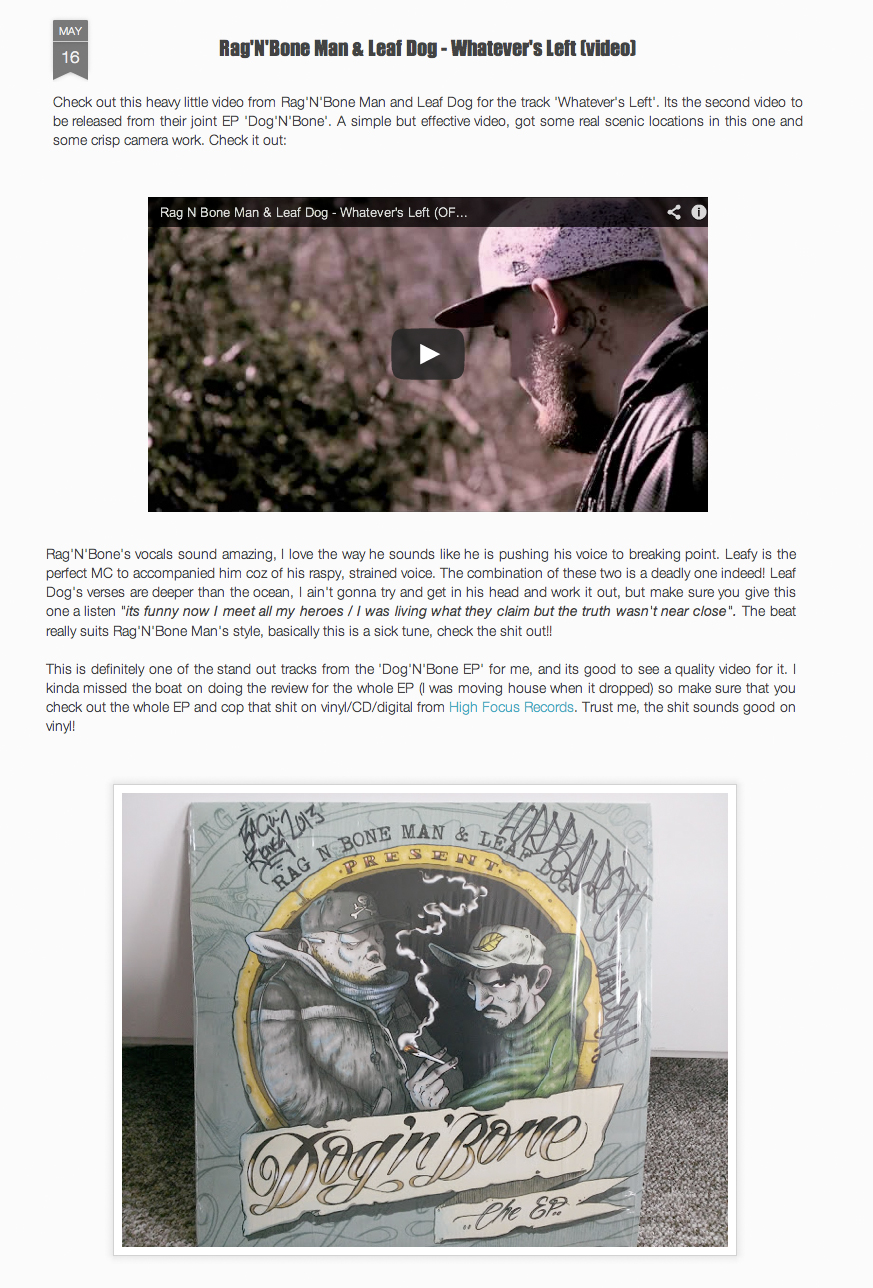 Rag N Bone Man & Leaf Dog – Dog N Bone EP – ShandySmokePizzeria Review High Focus2013-08-02T12:10:36+00:00April 27th, 2013|Leaf Dog, Press, Rag N Bone Man|