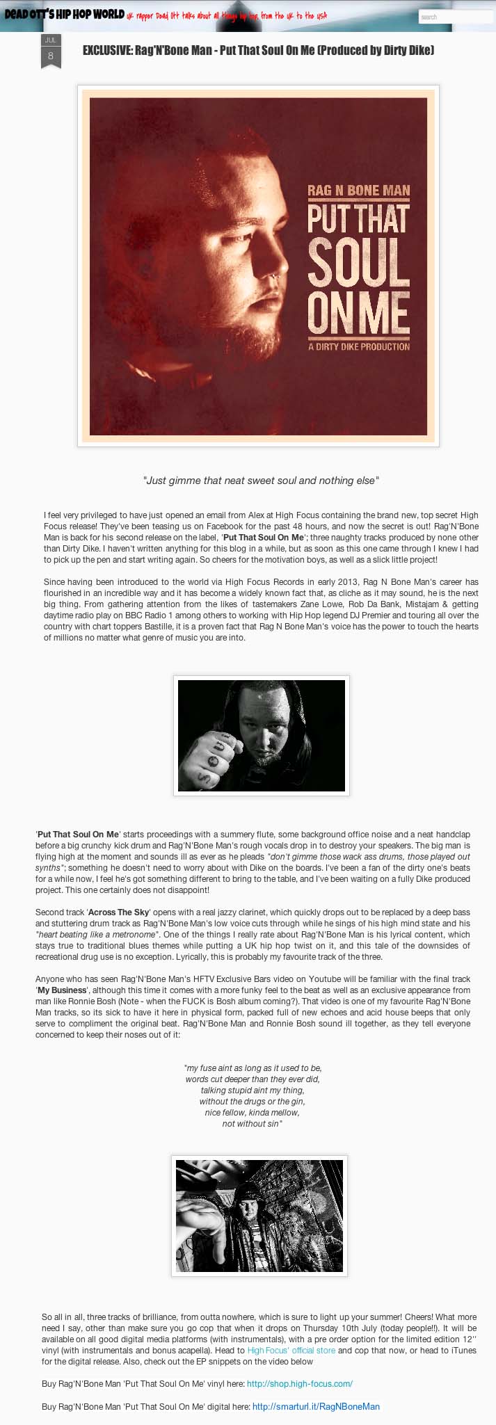 Rag N Bone Man – Put That Soul On Me – Dead OTT Review High Focus2014-07-15T15:22:35+00:00July 15th, 2014|Dirty Dike, Press, Rag N Bone Man| http://styxmen.blogspot.co.uk/2014/07/exclusive-ragnbone-man-put-that-soul-on.html