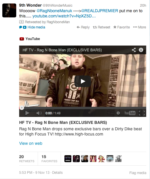 Rag N Bone Man Catches The Attention of 9th Wonder & DJ Premier! High Focus2013-11-10T22:49:46+00:00November 10th, 2013|Press, Rag N Bone Man| Follow Rag N Bone Man on Twitter : twitter.com/RagNboneManuk