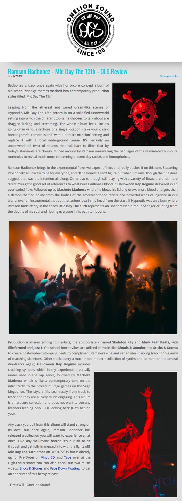 Ramson Badbonez – ‘Mic Day The 13th’ – One Lion Sound Album Review High Focus2019-01-30T16:41:58+00:00January 30th, 2019|Press, Ramson Badbonez| https://www.onelionsound.com/ols-uk-hip-hop-blog/ramson-badbonez-mic-day-the-13th-ols-review#