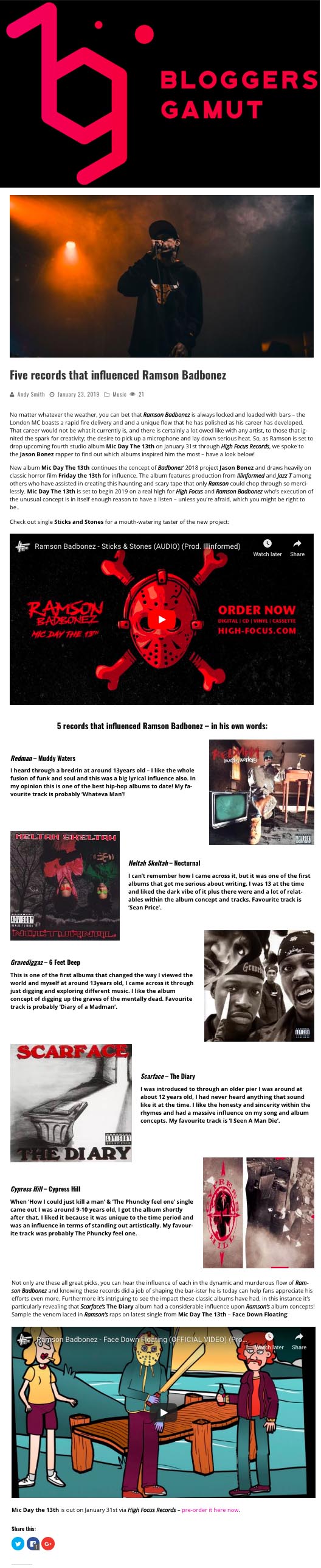Ramson Badbonez – 5 influential Albums With Bloggers Gamut High Focus2019-01-23T16:12:37+00:00January 23rd, 2019|Press, Ramson Badbonez| http://bloggersgamut.com/music/ramson-badbonez-five-records-that-influenced-him/