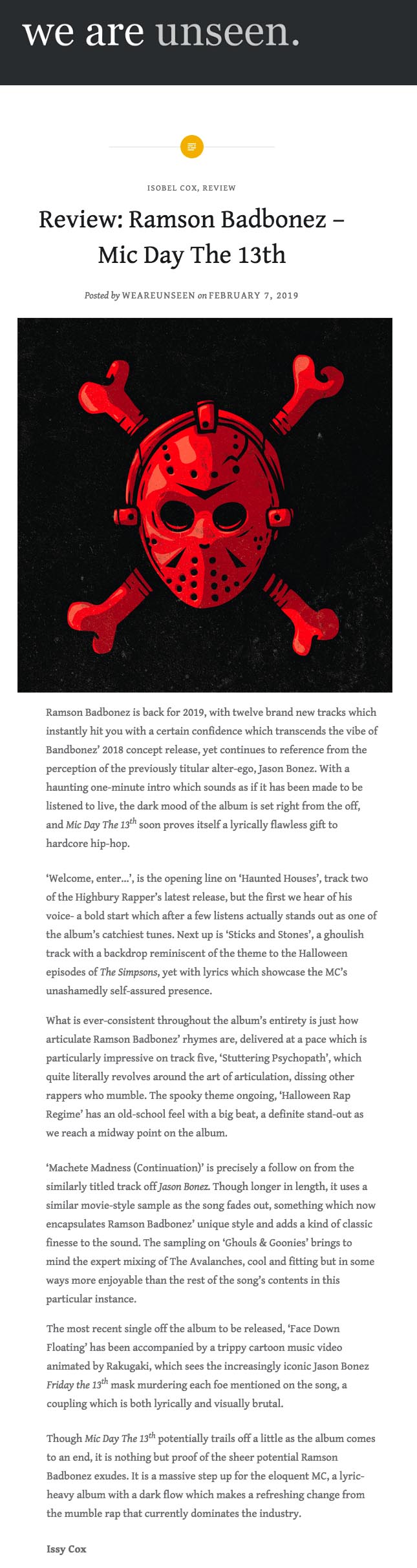 Ramson Badbonez – ‘Mic Day The 13th’ – We Are Unseen Album Review High Focus2019-02-07T15:36:33+00:00February 7th, 2019|Press, Ramson Badbonez|