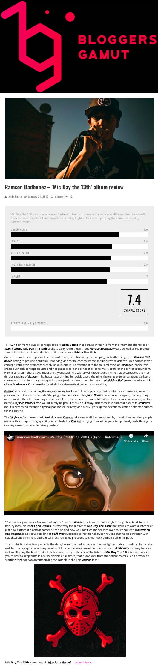 Ramson Badbonez – ‘Mic Day The 13th’ – Blogger’s Gamut Album Review High Focus2019-02-05T10:35:48+00:00February 5th, 2019|Press, Ramson Badbonez| http://bloggersgamut.com/albums/ramson-badbonez-mic-day-the-13th-album-review/