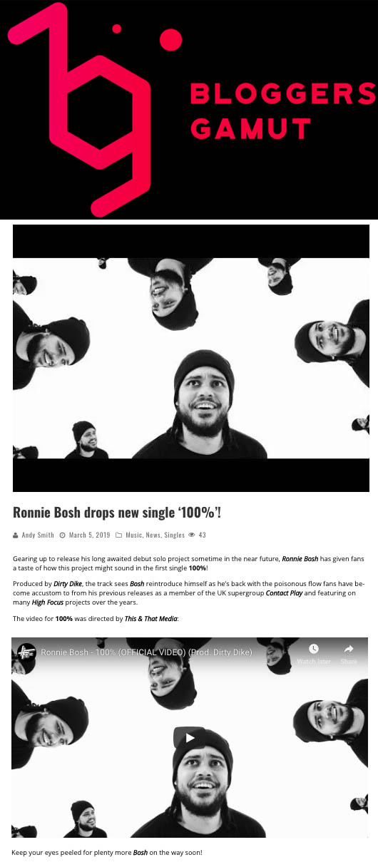 Ronnie Bosh – ‘100%’ – Blogger’s Gamut Feature High Focus2019-03-11T11:37:48+00:00March 11th, 2019|Press, Ronnie Bosh| http://bloggersgamut.com/singles/ronnie-bosh-drops-new-single-100/