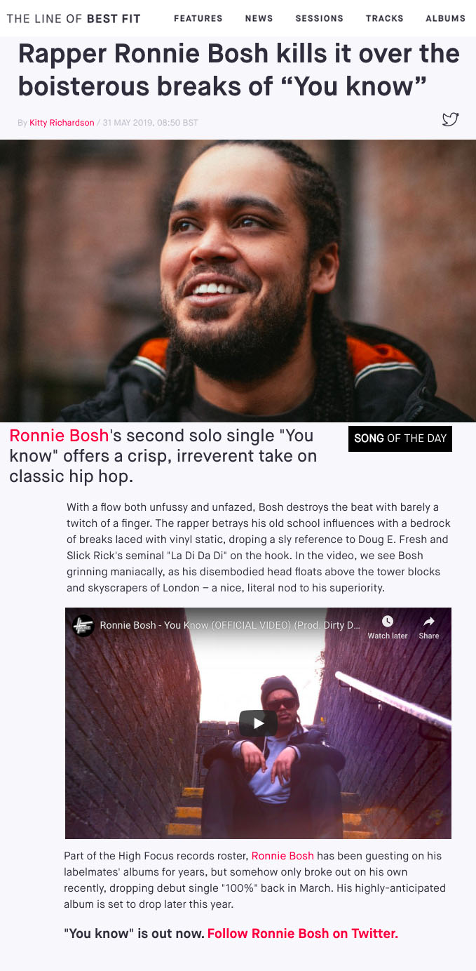 Ronnie Bosh – ‘You Know’ – Song Of The Day @ Line Of Best Fit High Focus2019-05-31T11:19:11+00:00May 31st, 2019|Press, Ronnie Bosh| https://www.thelineofbestfit.com/new-music/song-of-the-day/ronnie-bosh-you-know