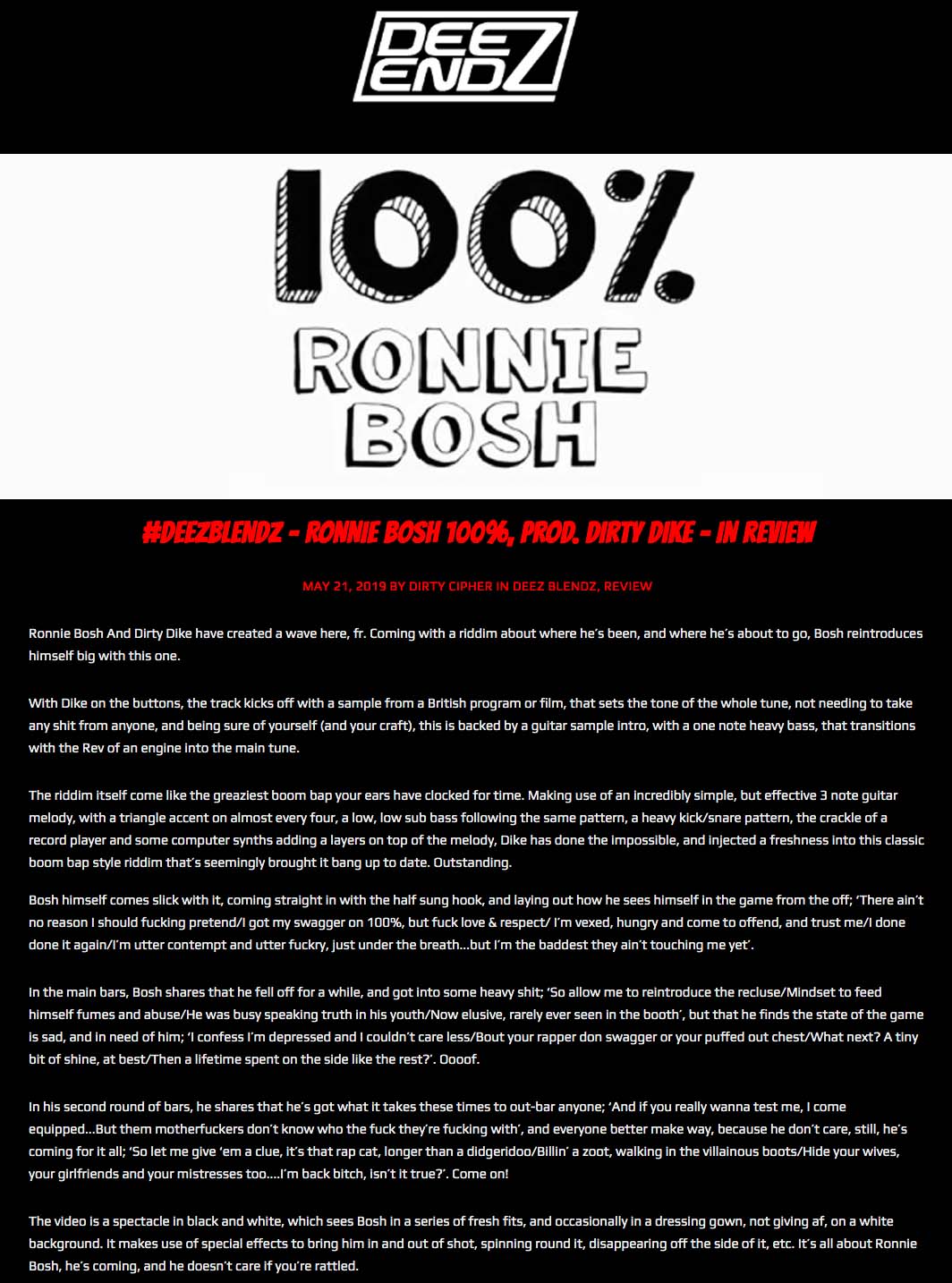 Ronnie Bosh – ‘100%’ – Deez Endz Single Review High Focus2019-05-23T09:03:20+00:00May 23rd, 2019|Press, Ronnie Bosh| https://www.deezendz.com/latest/deezblendz-ronnie-bosh-100-prod-dirty-dike-in-review