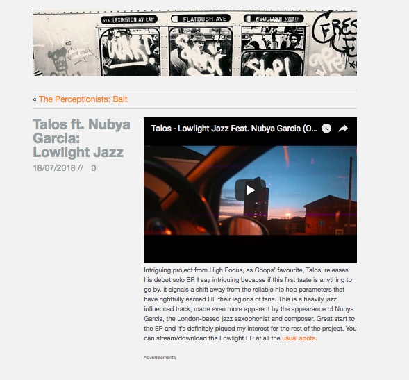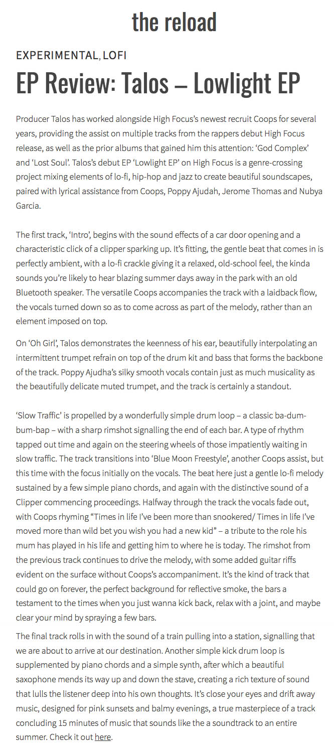 Talos – ‘Lowlight EP’ – Gingerslim Feature High Focus2018-07-18T12:39:36+00:00July 18th, 2018|Press, Talos| Talos ft. Nubya Garcia: Lowlight Jazz