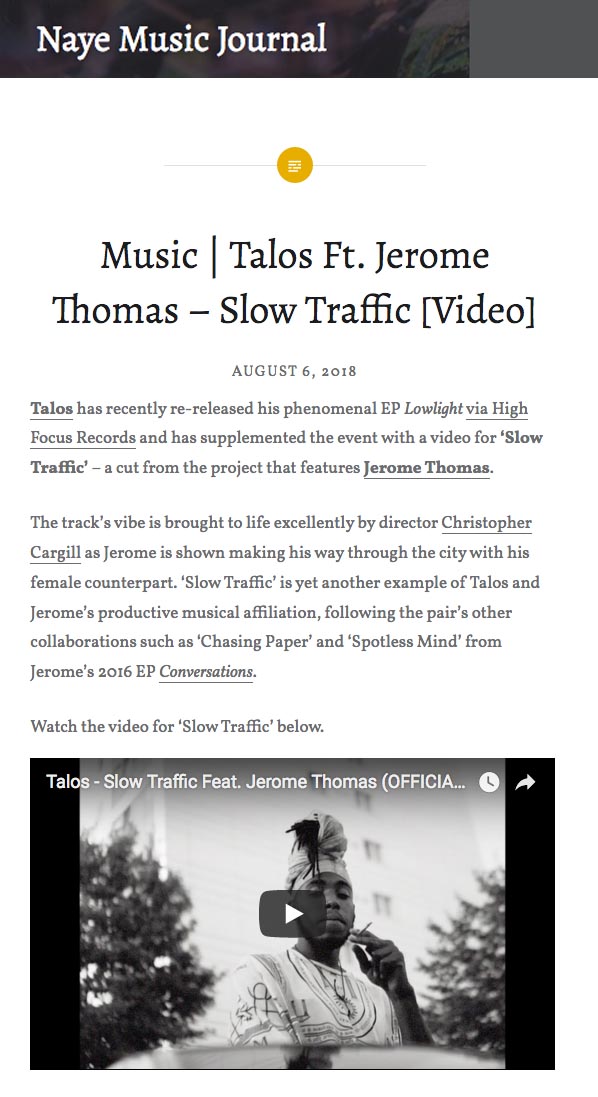 Talos – ‘Slow Traffic’ Feat. Jerome Thomas – Naye Music Journal Feature High Focus2018-08-07T09:35:32+00:00August 7th, 2018|Press, Talos| Music | Talos Ft. Jerome Thomas – Slow Traffic [Video]