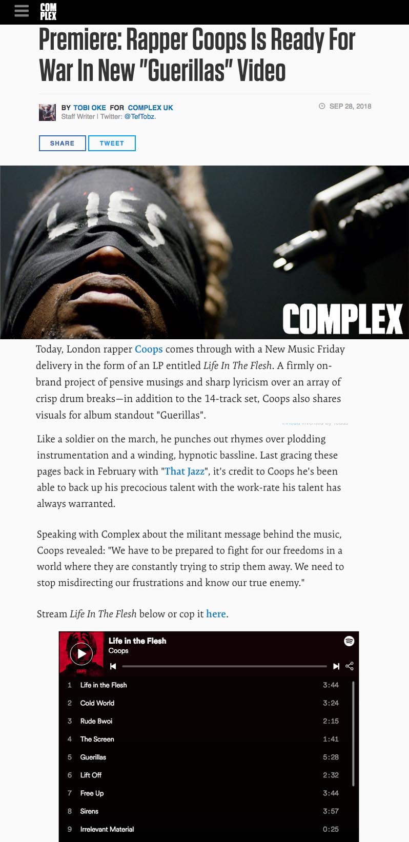 Coops – ‘Guerillas’ Exclusive World Premiere With Complex UK High Focus2018-09-28T13:04:07+00:00September 28th, 2018|Coops, Press, Talos| https://www.complex.com/music/2018/09/premiere-coops-guerillas-video