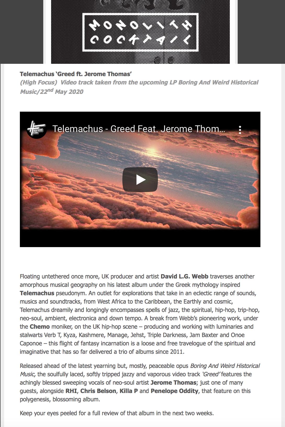 Telemachus – ‘Greed’ – Monolith Cocktail Feature High Focus2020-05-29T16:05:54+00:00May 28th, 2020|Press, Telemachus|