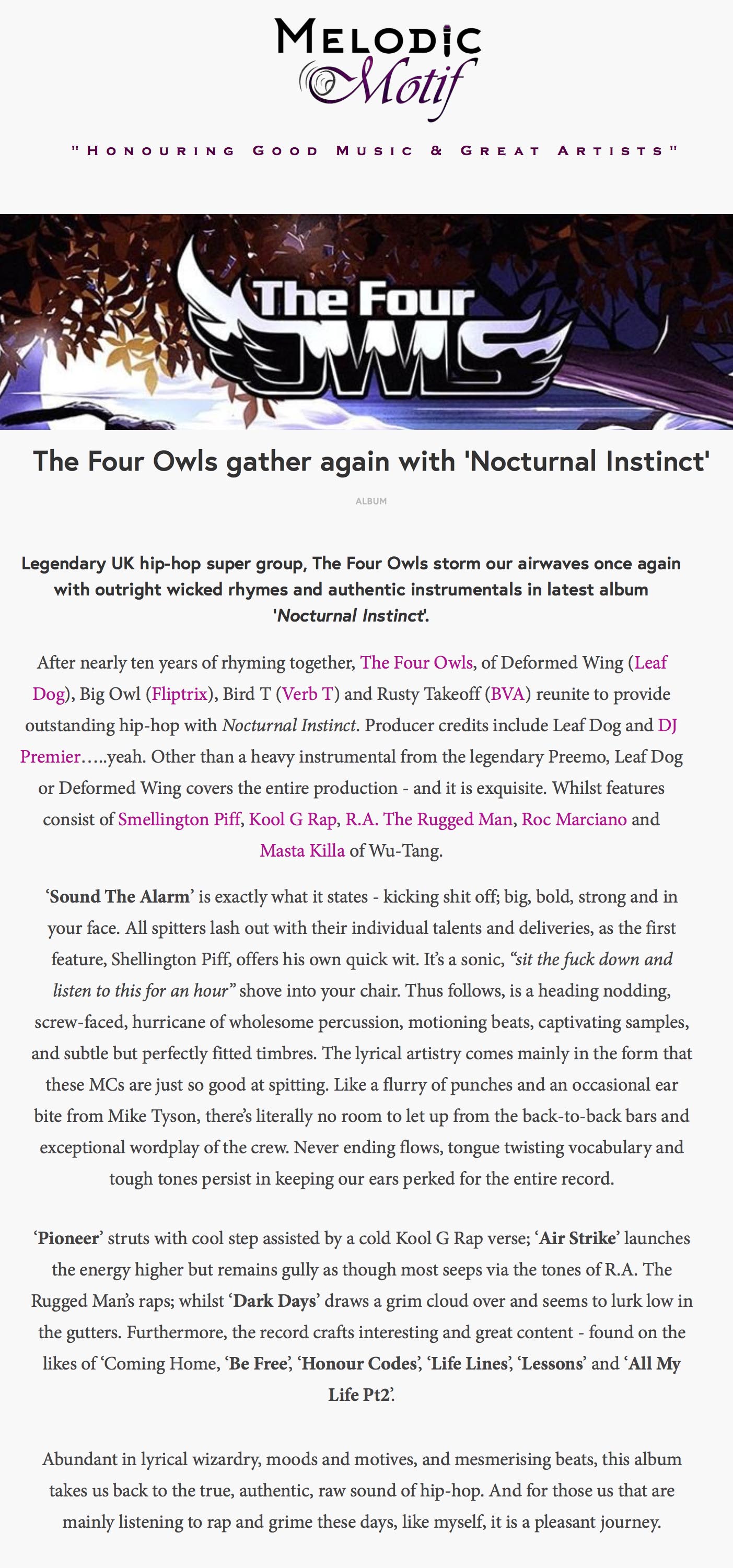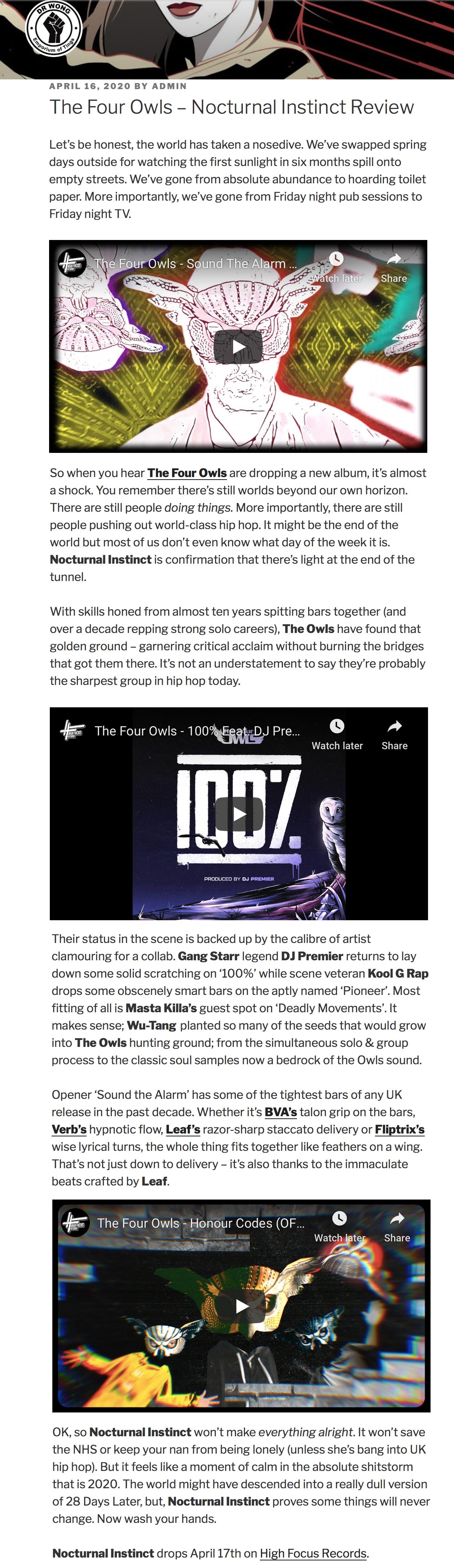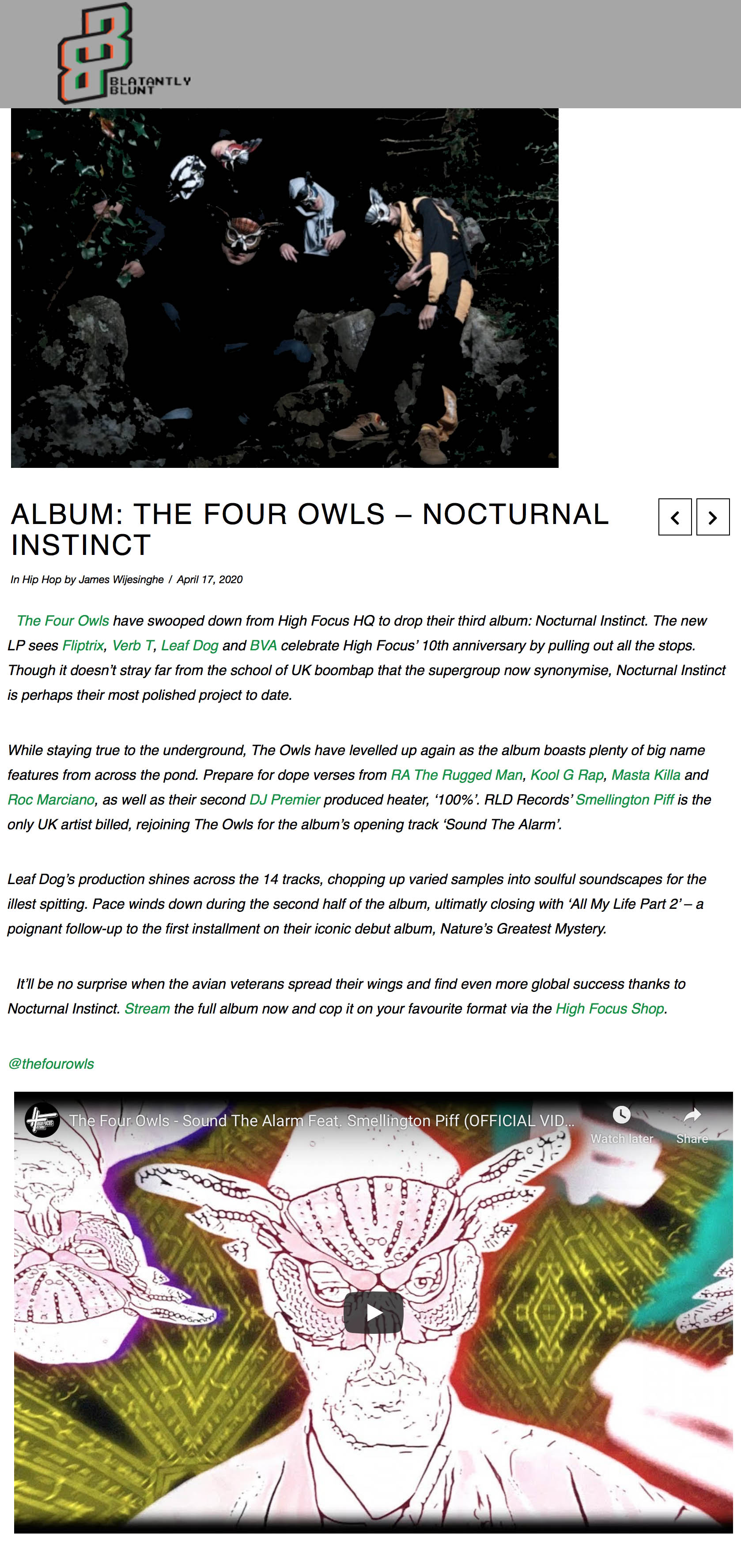 The Four Owls – ‘Nocturnal Instinct’ – Blatantly Blunt Album Review High Focus2020-04-23T14:22:53+00:00April 23rd, 2020|Press, The Four Owls|